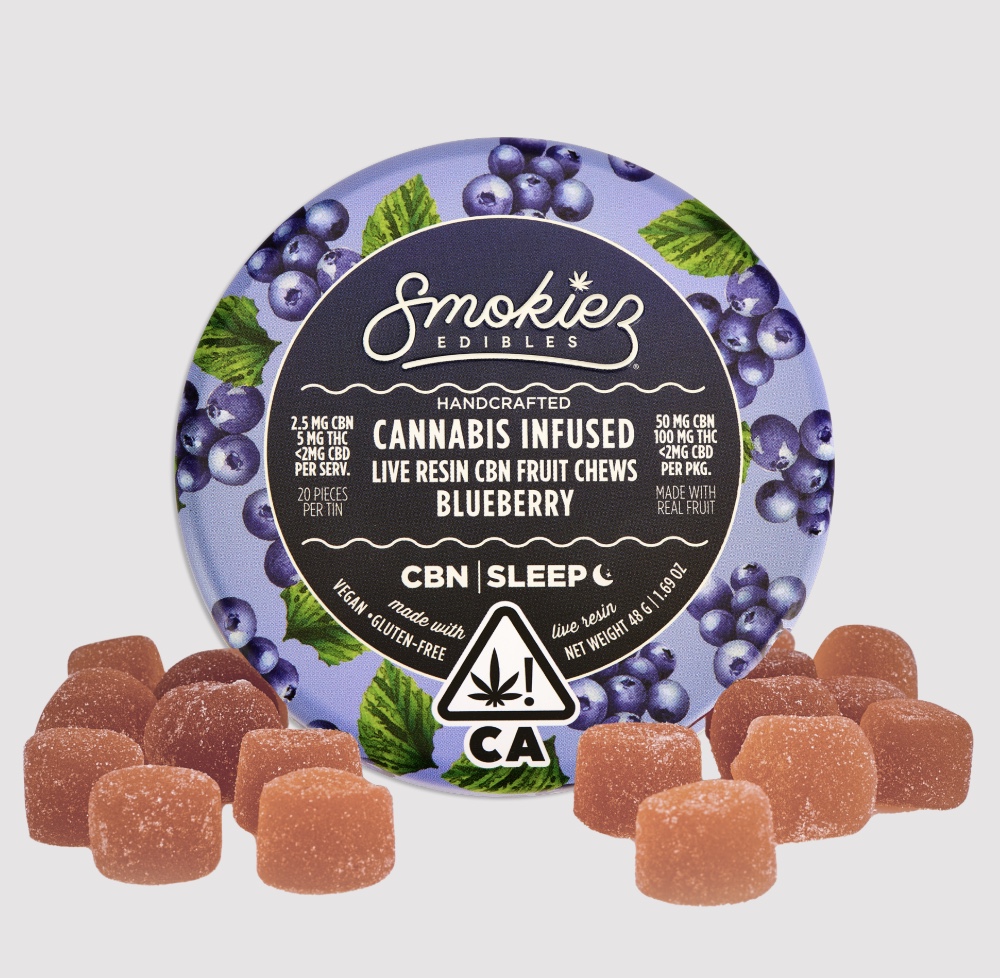 Smokiez™ 2:1 Live Resin CBN Blueberry Fruit Chews, great for sleep and packaged in a conveniently sized stainless steel tin. Thoughtfully extracted from full spectrum fresh-frozen cannabis - retaining all those flavorful terpenes typically lost in the curing phases. These terpenes simultaneously combined with our delicious fruit flavors result in a full-sensory, extra-flavorful, & seriously potent gummy. These delicious mini fruit chews are handcrafted with real fruit and an all natural recipe. • Vegan & Gluten-Free • 100 mg THC + 50 mg CBN per Package, 20 pieces, 5 mg THC + 2.5mg CBN per piece • 100% Natural Plant Based Colors - May change slightly from batch to batch!